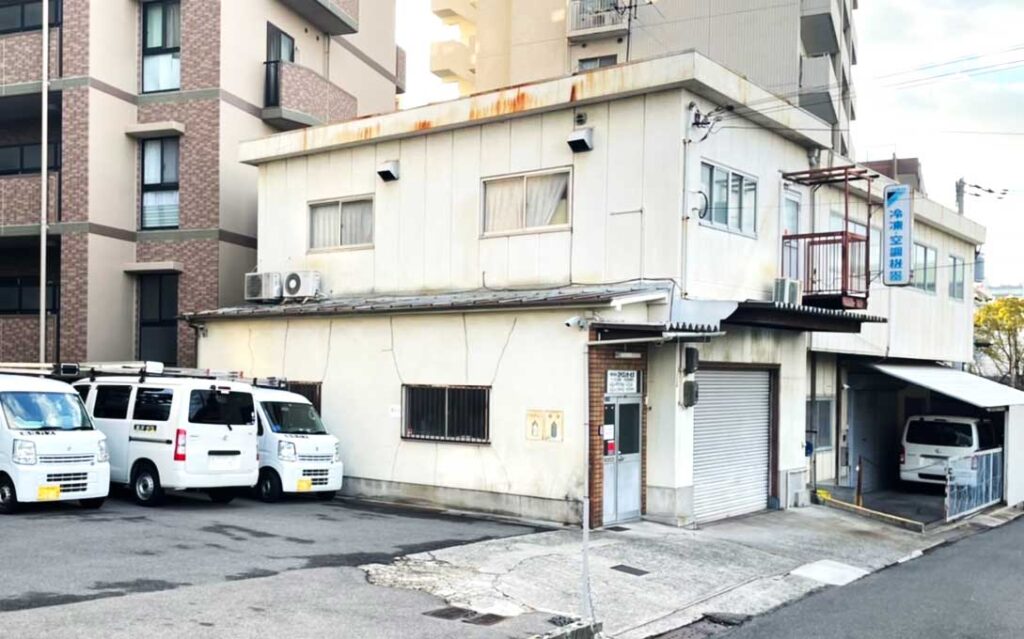 事務所外観。なかなか年季が入っています。ダイキン工業のマークの入った看板を掲げています。エヤコンサービスはダイキン工業(株)のサービス特約店でもあります。