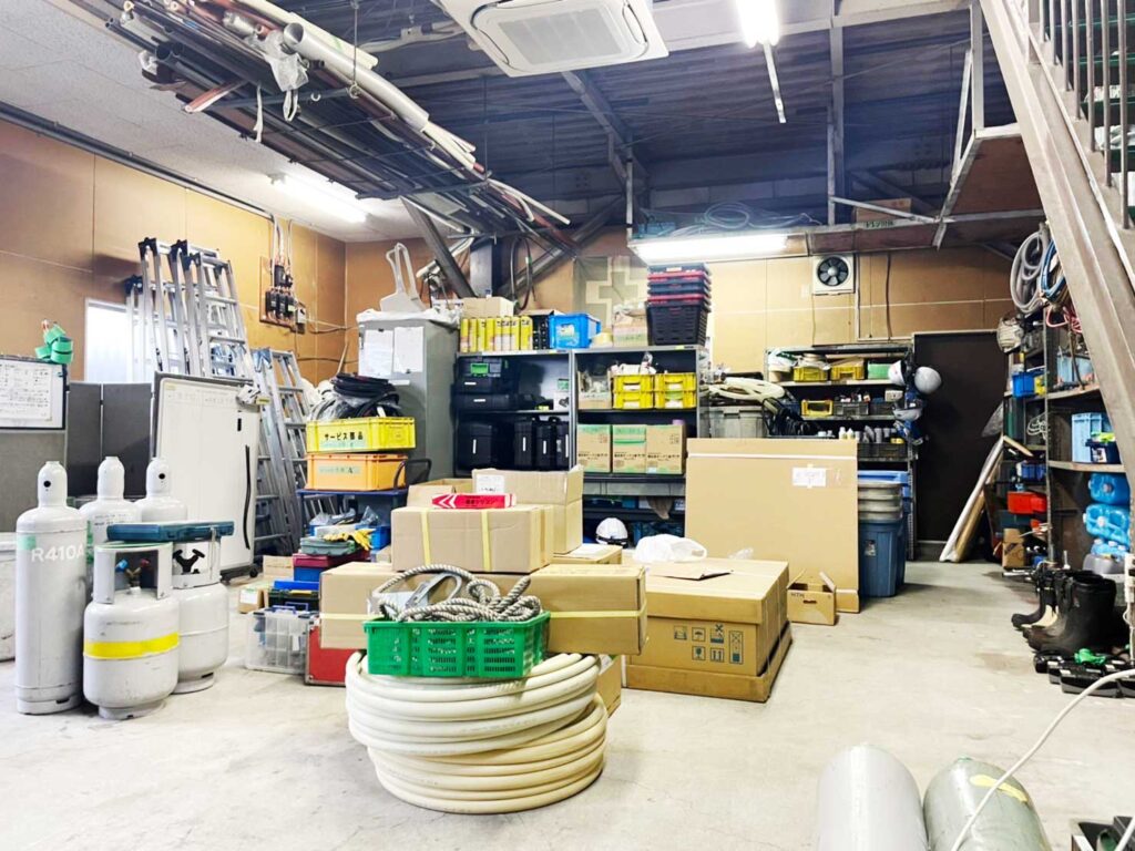 事務所1階が倉庫です。材料や工具を保管するだけでなく作業をすることもあります。