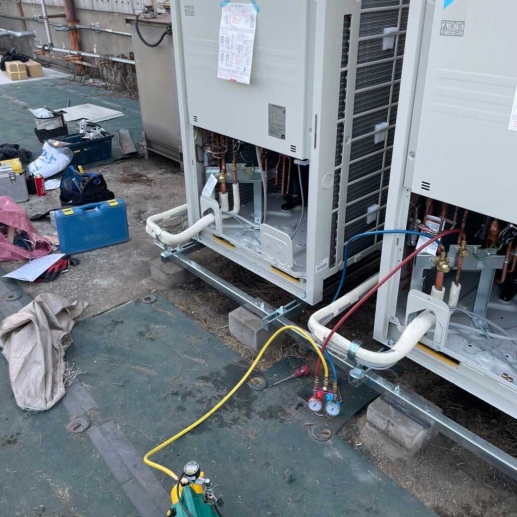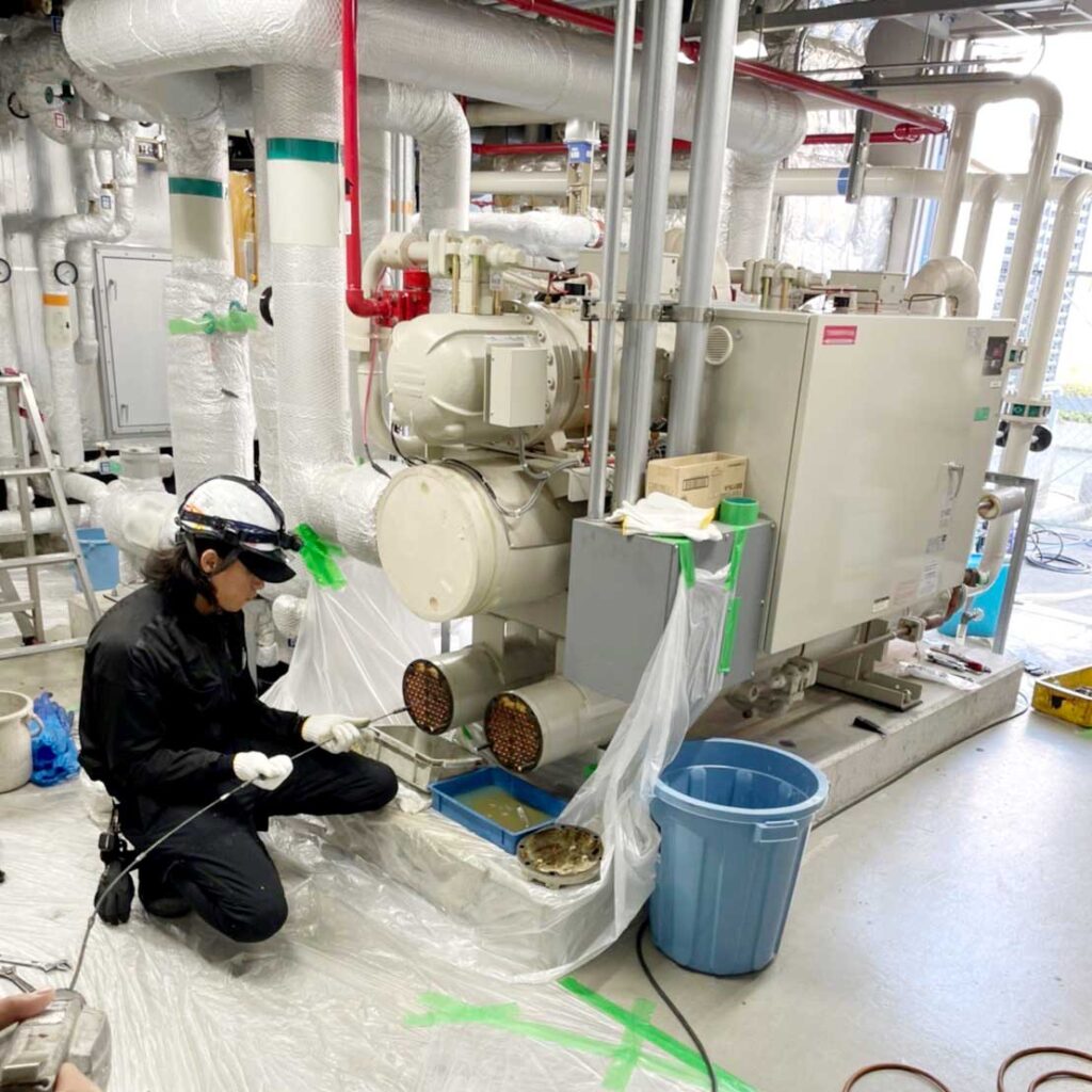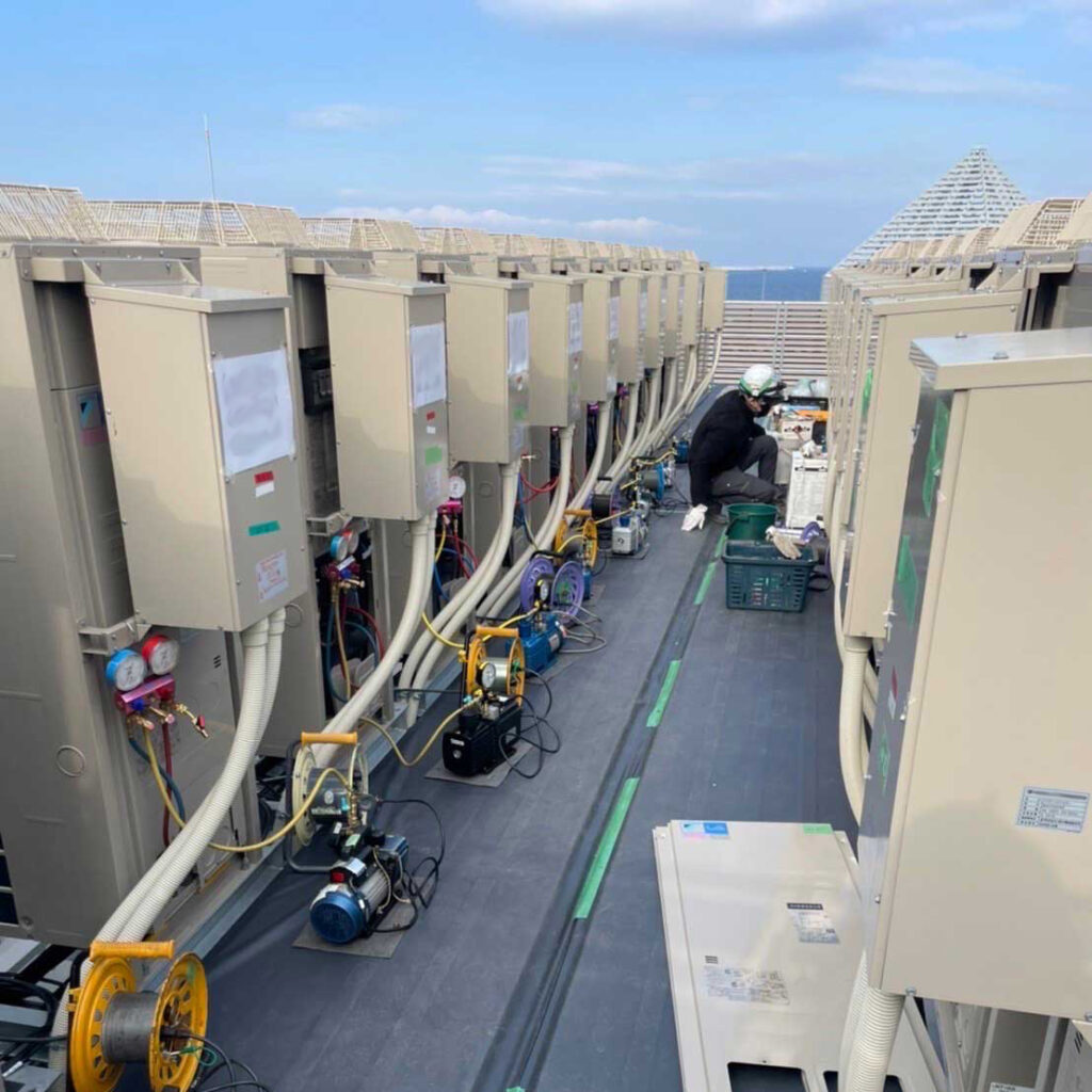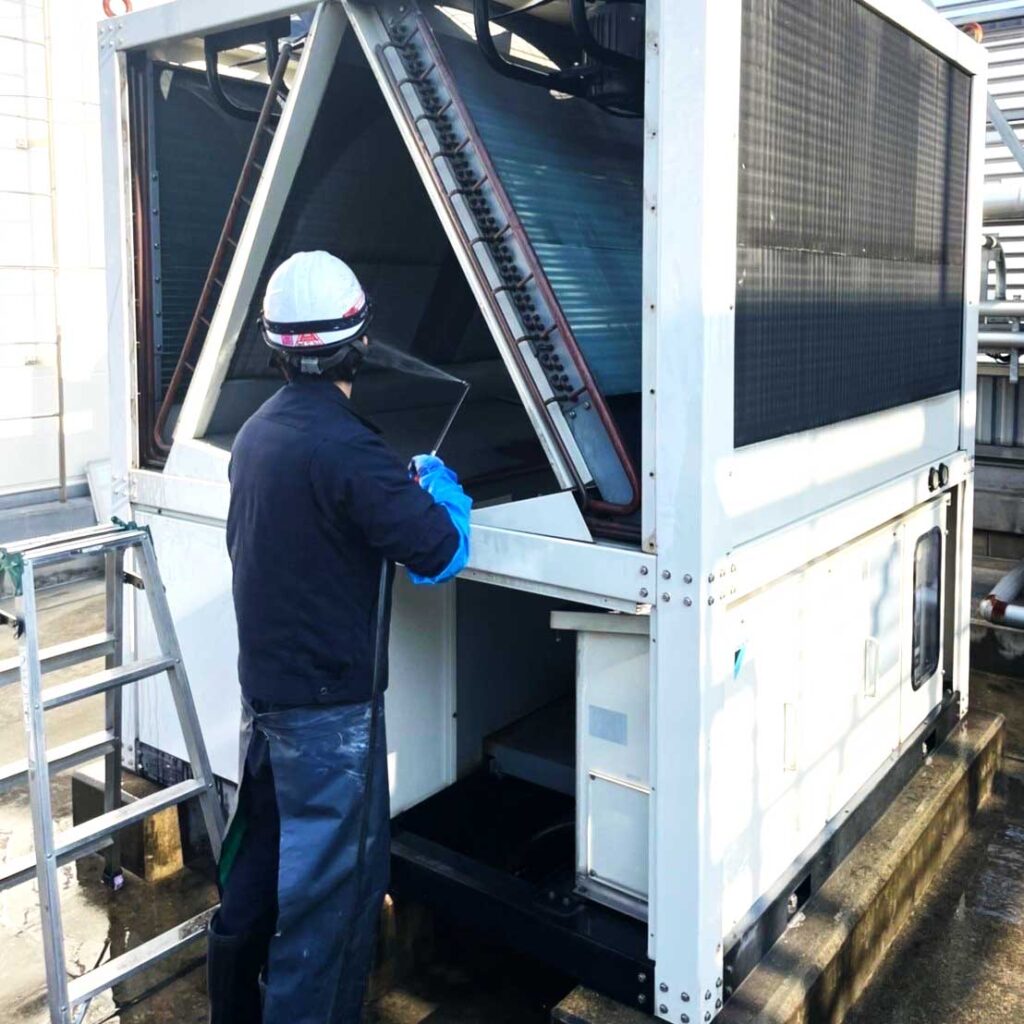 事業紹介 2023-03-142023-03-17 各種空調設備点検整備 主に一般顧客様や各元請様からのご依頼にて、家庭用・店舗用・工場用・クリーンルーム等の空調設備点検修理、保守点検整備、フロン排出抑制法に基づく漏洩点検を行っています。 施工事例 開放型冷却塔充填材高圧洗浄 コンデンシングユニット凝縮器化学洗浄 水冷ブラインチラー凝縮器ブラシ洗浄 空冷チラーフィン高圧洗浄 設備用エアコン設置工事 冷凍冷蔵設備試運転前真空乾燥作業